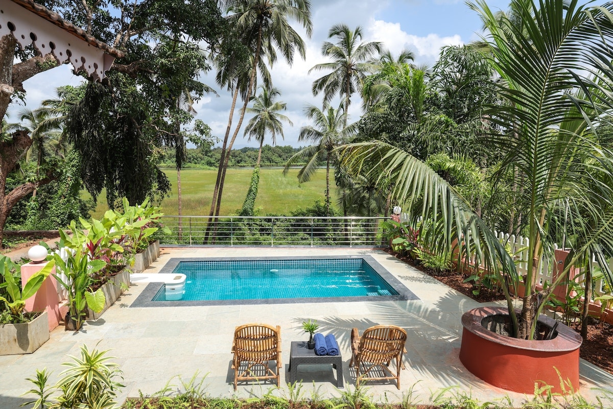 Forget your worries in this spacious and serene space. This 130-year-old Portuguese House invites all to come and experience a piece of Goa and its rich heritage. Nestled amidst a quiet village of Goa, surrounded by coconut, cashew, and Spice plantations. Take a walk along the lush green backwaters of the Village and feel the quiet air and peace surrounding it. Bring the whole family to this great place with lots of room for fun.